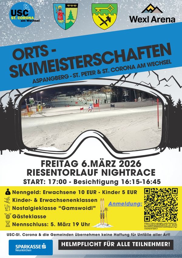 Am 06.03.2026 finden die gemeinsamen Ortsskimeisterschaften der Gemeinden Aspangberg-St. Peter sowie St. Corona am Wechsel bei uns in der Wexl Arena statt.