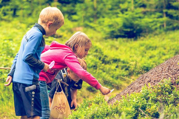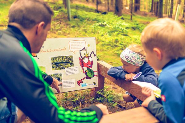 Auf dem 2,5 Kilometern langen & kostenlos begehbaren Themenwanderweg lernt man in 15 Stationen verständlich und spielerisch über das Leben der Ameise im Wald: Welche Aufgaben hat sie, wer sind ihre Nachbarn und wie baut und pflegt sie ihr Königreich?