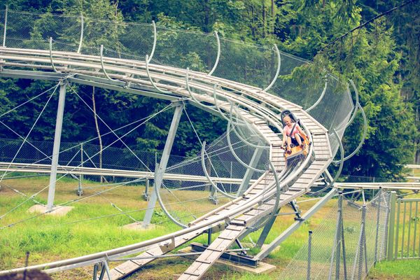 Die Ampel schaltet auf Grün, die Spannung steigt: Jetzt beginnt die rasante Rodelfahrt durch Steilkurven, Kreisel und entlang des Waldes.