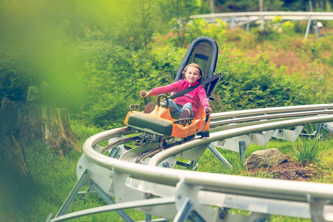 On the right side of the conveyor belt, there is an easier track for children, which features gentle curves and flat wooden elements, leading down through the meadow.