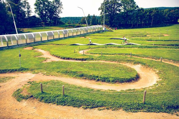 The 90m conveyor belt turns into a moving carpet for the bikes. Whether small or big, the trails are suitable for testing, practicing, and also improving technique on the mountain bike.